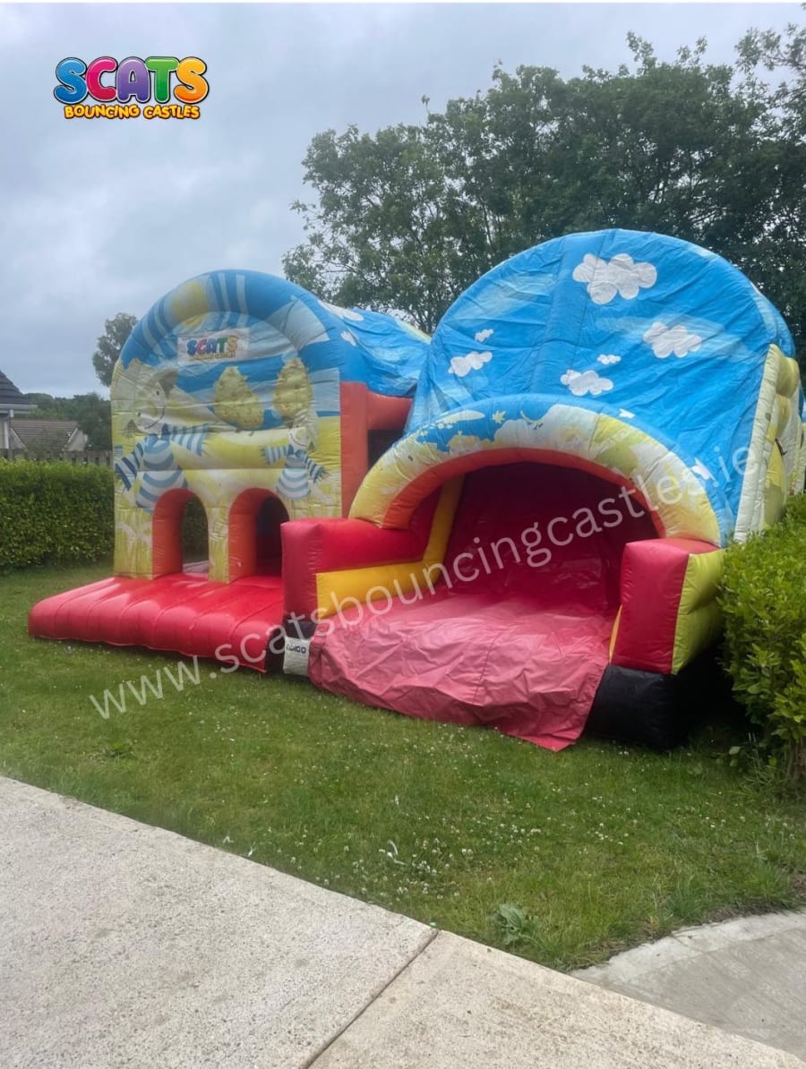 This large enclosed wonderland features not one, but two side-by-side courses, ensuring double the excitement and double the fun! With an arch entrance welcoming you into the adventure, a jump-through area inviting boundless leaps of joy, winding tunnels to explore, pop-up tubes to conquer, and the all-important slide to cap off the excitement, this unit is a playground paradise for both boys and girls.
