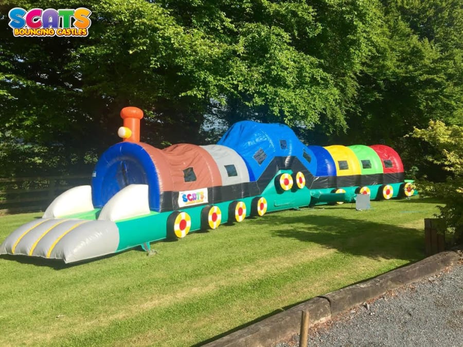 Size: 40ft x 8.5ft Check out our Train Tunnel obstacle course!It's a long tunnel with a small climbing wall and slide. This 40 ft long train is easy to go through, that's why it is suitable for smaller kids. It is fully enclosed to keep the Irish weather out. Give your little ones a day to remember with this very cool train tunnel. It is bright and colorful and kids are going to love it! It will be great for boys as well as for girls.