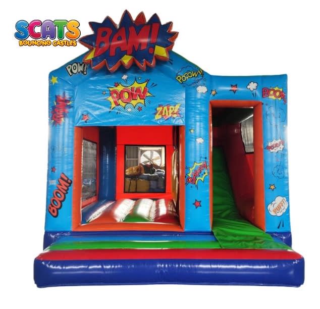 Our fantastic Comic Book themed combi unit is a 2 in 1 castle which consists of a large bouncy area and a slide for some extra fun. It features colourful eye catching Bam and POW which is digitally printed throughout the unit and it's very eye catching. Kids are going to love bouncing around with in this colourful combi!