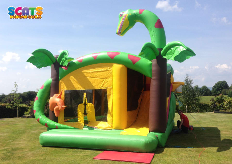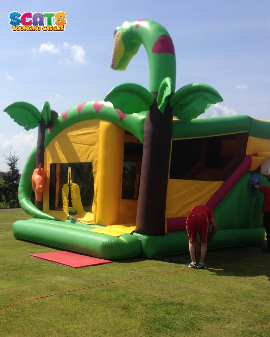 Book our fantastic Snake combi today and make your party a day to remember. It features a big snake, tropical trees and a small dinosaur at the entrance to the bouncy area. The snake's head is so high it will be seen from distance. This unit is with no doubt very impressive and kids are going to love it! The bouncy area is accompanied with a slide on the side. If you're planning a birthday party, communion, confirmation or a big field event, this combi won't disappoint! It is fully covered so even a rainy day won't ruin the fun! It is suitable for both boys and girls.