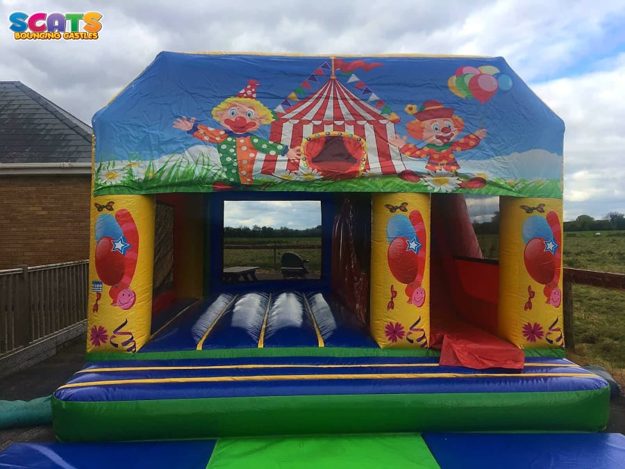 Our combi units are very popular among kids. Why just get a bouncy castle, if you can have both? Hire with Scats Bouncing Castles and make your day a little more special with one of our combi units! Our Clown Around themed bouncing castle is multicolored and has a fantastic clown artwork and has a spacious bouncing area with a roof and a slide to the side. It is perfect for smaller children, however it is suitable for children of all ages. Our team will arrive at your door a little bit before your party so you can be sure everything will be ready to go when guests arrive! After we set everything up ourselves, we also take it down! You don't have to worry about anything with Scats bouncing Castles!