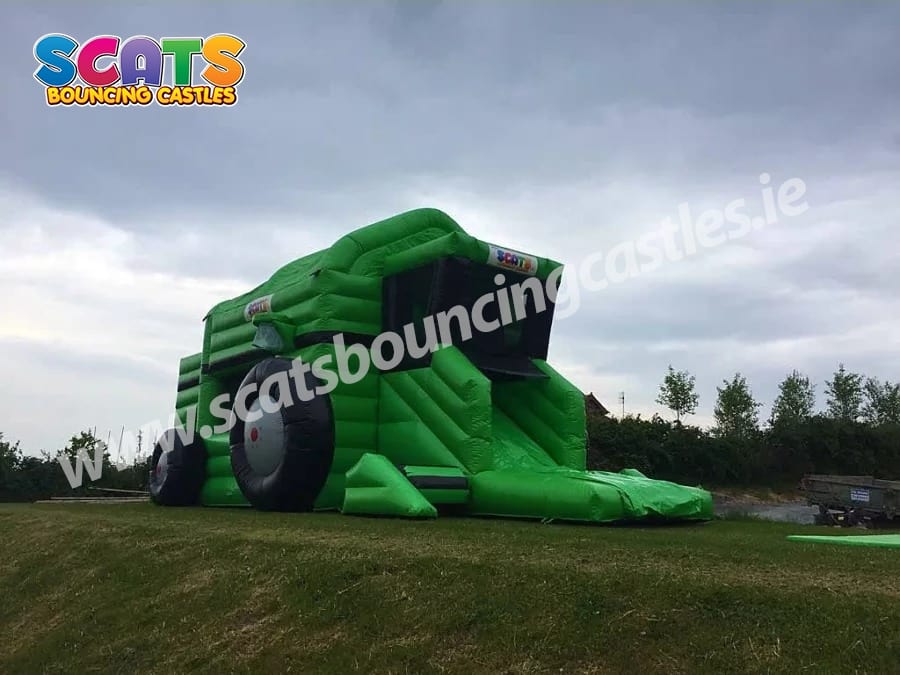 Saddle up and take a gander at our brand spankin' new 3 in 1 Combine Harvester Combi Unit! This here marvel boasts a spacious bouncing area and a slide, with an added bonus of a basketball hoop for some good ol' farmyard fun. Painted mostly in verdant greens and fashioned in the shape of a mighty combine harvester, this unit is a real hoot! While it may be a hit with the older young'uns, rest assured, it's suitable for cowpokes of all ages!