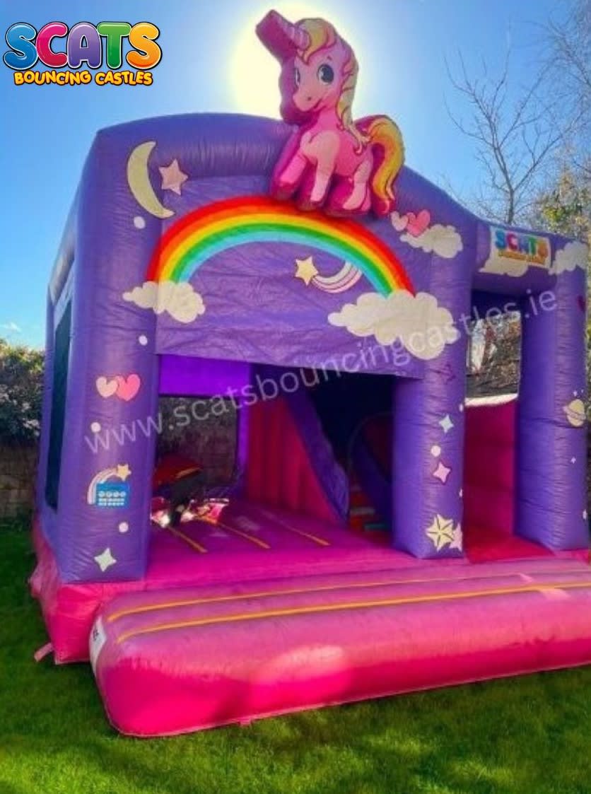 Introducing our enchanting Unicorn-themed combi unit, fresh to Scats Bouncing Castles! This magical unit features a spacious bouncy castle area and a slide to the side, adorned with captivating digital prints of a majestic Unicorn at the forefront. Suitable for children aged 2 and up, it boasts supervised netting all around, ensuring a safe and secure play environment. Plus, with its full coverage, there's no need to fret about the weather dampening the festivities!