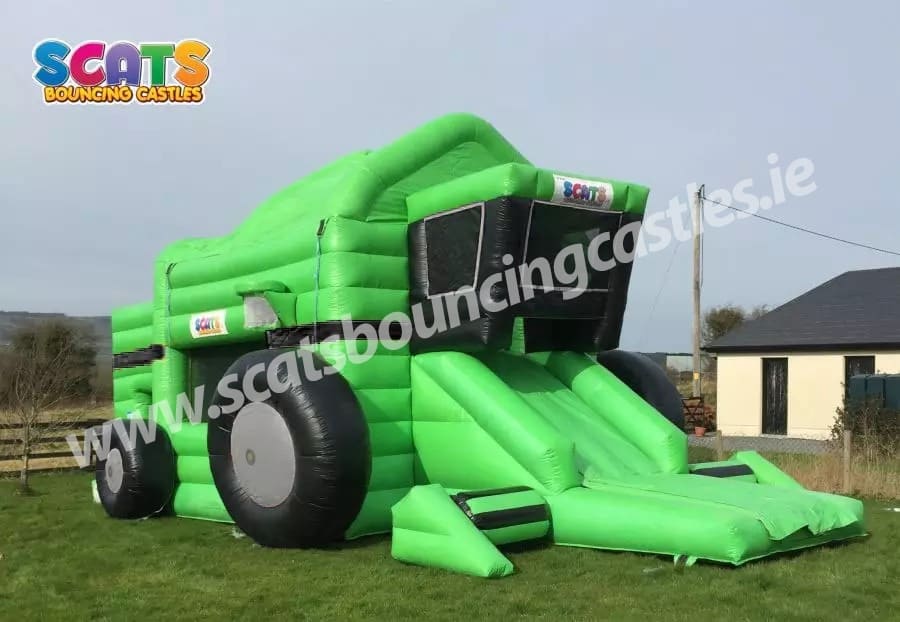 Saddle up and take a gander at our brand spankin' new 3 in 1 Combine Harvester Combi Unit! This here marvel boasts a spacious bouncing area and a slide, with an added bonus of a basketball hoop for some good ol' farmyard fun. Painted mostly in verdant greens and fashioned in the shape of a mighty combine harvester, this unit is a real hoot! While it may be a hit with the older young'uns, rest assured, it's suitable for cowpokes of all ages!