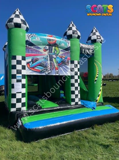 Hey there, check out our awesome New Racing Combi unit! It's got a big enclosed Bouncy Area and a Slide to zip down on the side.