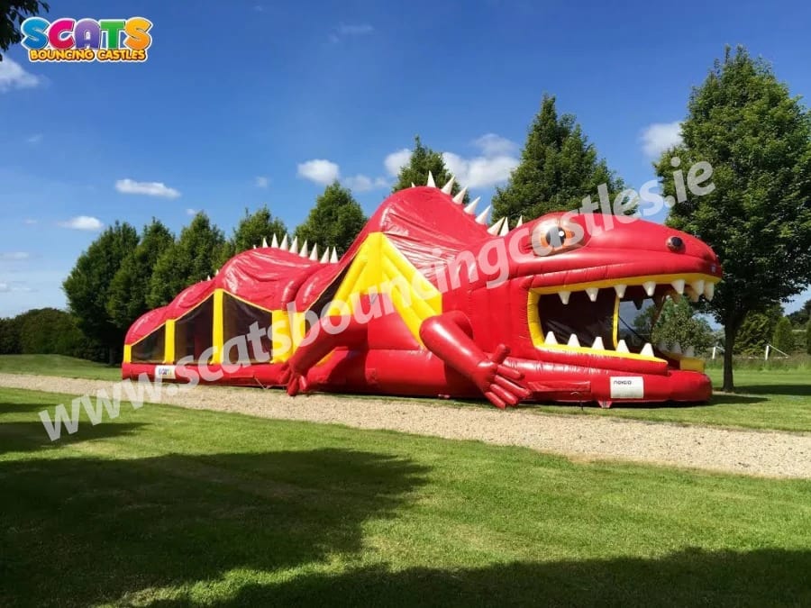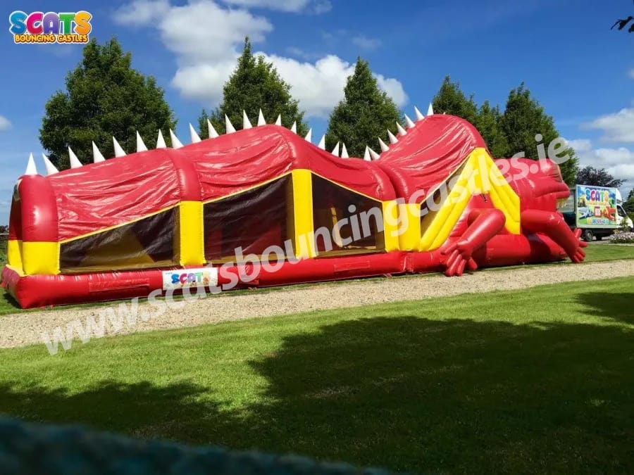 Picture this: a two-lane obstacle course adorned with vibrant colours and exciting features, including a large slide, a smaller slide, pop-up obstacles, tunnels, and bouncy areas. As you enter through the mouth of the magnificent lizard, the adventure begins, sparking joy and laughter at every turn!