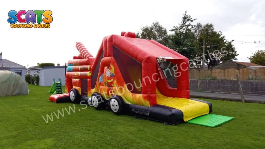 This thrilling attraction features a fully enclosed bouncy area and a towering high slide, all adorned with a vibrant Fireman themed design that'll set hearts ablaze! With digitally printed images of the heroic fireman and his mighty fire truck, this masterpiece is bursting with color and energy, guaranteed to ignite the imagination of children of all ages.