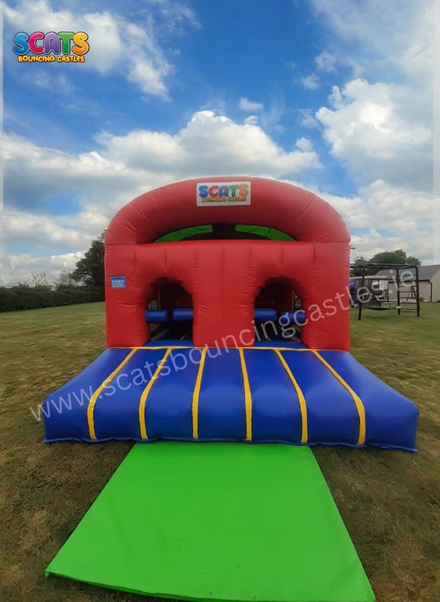 Embark on a thrilling journey through this two-lane obstacle course, where you'll navigate through inflatable pillars, conquer a challenging climbing wall, and weave through tunnels before reaching the pinnacle: a towering 10ft high climbing wall. Once you've conquered the climb, brace yourself for an adrenaline-pumping descent down the steep slide!